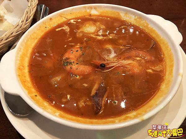 ▼地中海濃湯佐麵包,這裡的海鮮濃湯味道特別鮮美,加上濃郁的番茄酸,和海鮮搭在一起去腥解膩,非常順口。
