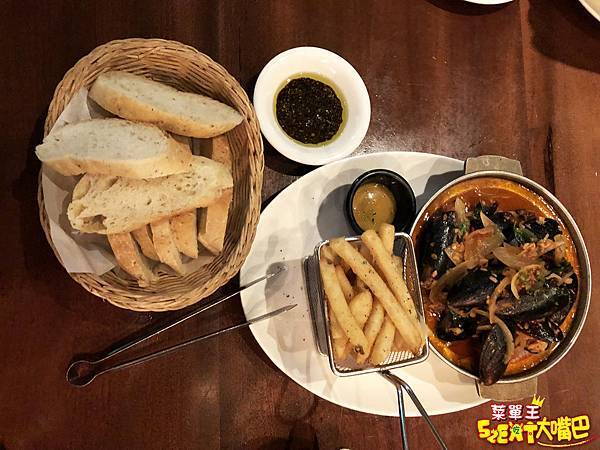 ▼比利時啤酒淡菜,辣味番茄,吃起來酸酸辣辣地加上帶菜的鹹、鮮、香好吃的沒話說,麵包配上義大利油醋也增加不少飽足感,用啤酒煨煮過的淡菜有一種說不出的鮮嫩。