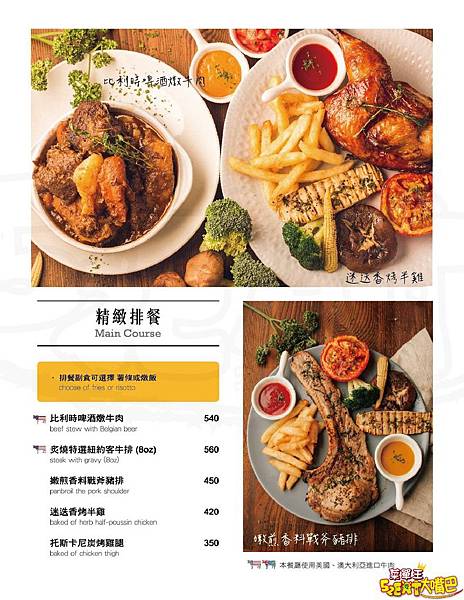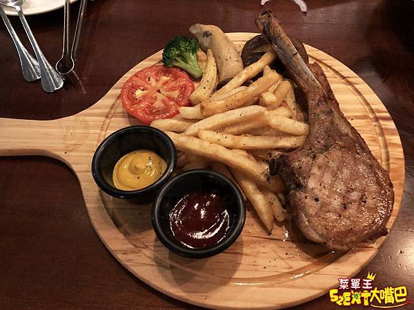▼戰斧牛排上桌了!戰斧牛排之所以叫戰斧牛排就是因為牠的外型很像斧頭,吃起來肉質較韌,小編覺得和蜂蜜芥末醬搭起來味道還意外的不錯…