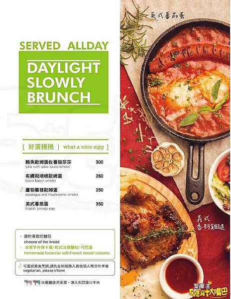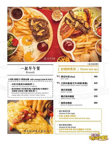 ▼全天候都有供應的早午餐,在晚上也吃得到,厚切牛排用的是美國牛肉,蛋和麵包都可以選擇自己喜歡的口味,今天選擇的是太陽蛋與軟式法國麵包,附上水果沙拉,還有附餐薯條,牛排可以搭配海鹽一起吃,鮮嫩多汁,欲罷不能!